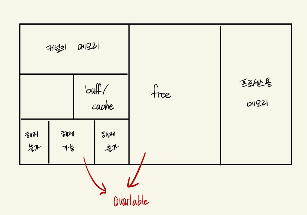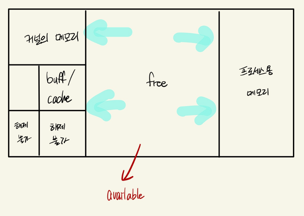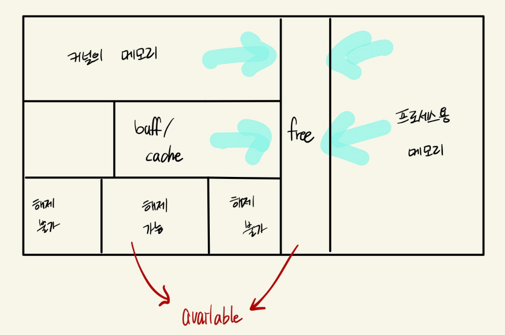 - available: 실질적으로 사용 가능한 메모리. free 값이 부족하면 해제되는 커널 내의 메모리 영역 사이즈를 더한 값.