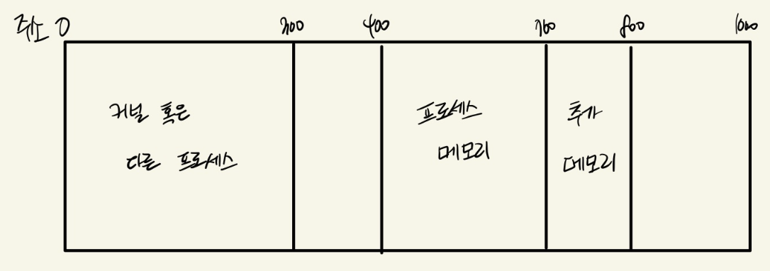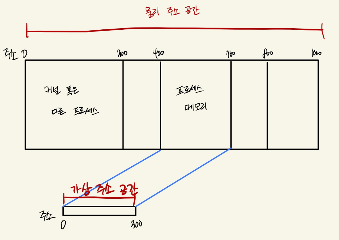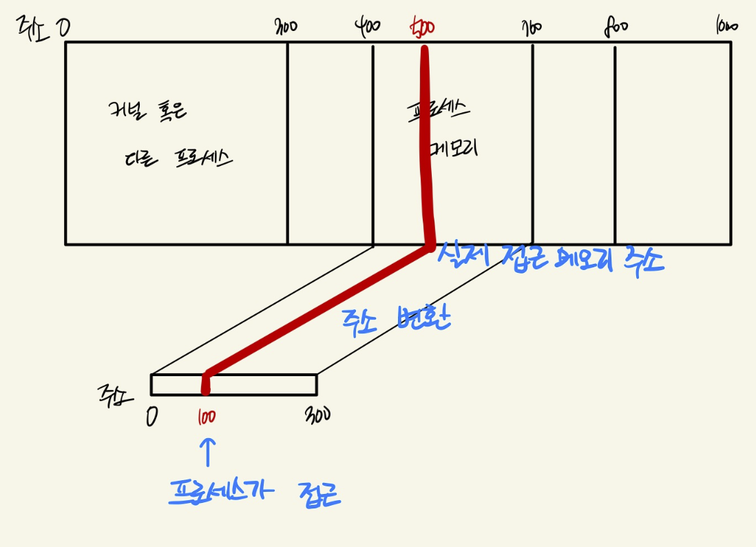 위 그림에서 프로세스가 주소 100번지에 접근하는 것은 실제 메모리에서 500번지에 접근하는 것과 같다. 프로세스가 물리 주소에 직접 접근하는 방법은 없다.