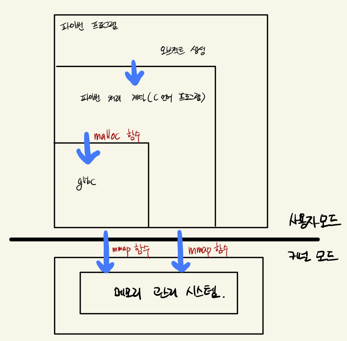 직접 메모리 관리를 하지 않는 파이썬과 같은 스트립트 언어에서 객체를 생성할 때 최종적으로는 C언어의 malloc()을 사용한다.