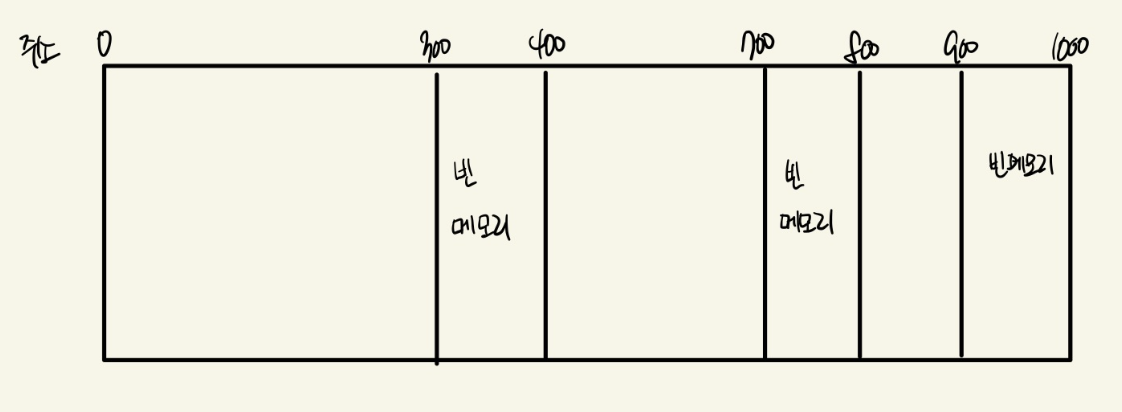 메모리의 빈 공간이 총 합이 300이 있더라도, 100 100 100 이렇게 나누어져있다면 100보다 큰 메모리 공간을 확보할 수 없다. 100으로 나누어진 세 공간을 하나의 공간으로 인식하려고 한다면 할 수야 있다. 하지만 추가로 메모리를 요청하여 얻은 뒤 얻은 메모리가 몇 개의 영역에 나누어져 있는지 매번 확인해야 하며, 100보다 큰 하나의 데이터(ex. 200만큼의 배열)를 만드는 용도로는 사용할 수 없다.