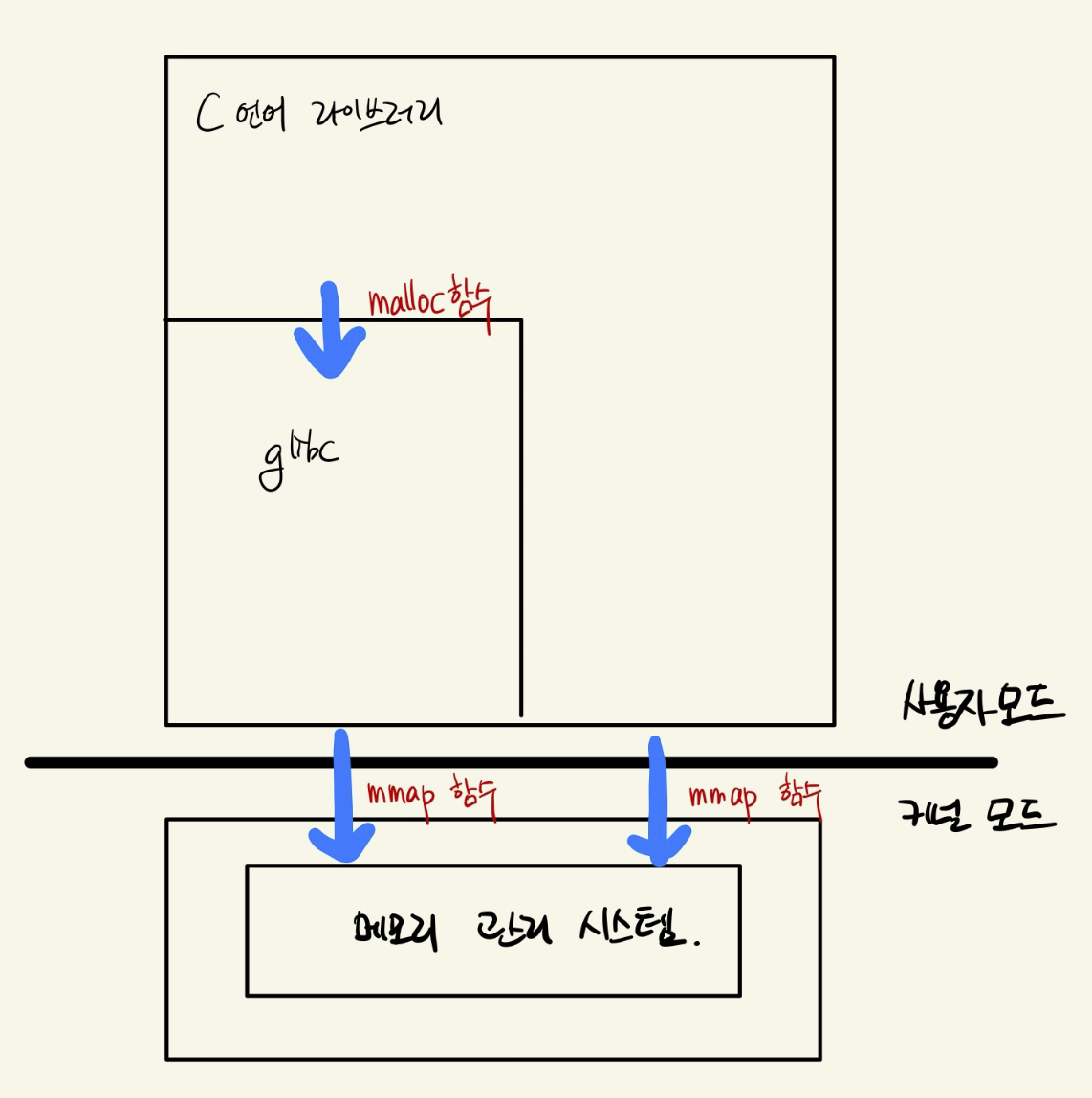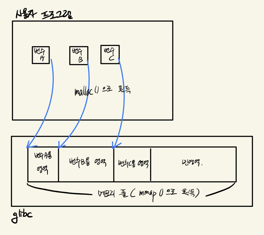 mmap() 함수는 페이지 단위로 메모리를 확보하지만 malloc() 함수는 바이트 단위로 메모리를 확보한다. glibc는 mmap() 시스템 콜을 이용해 커다란 메모리 공간을 미리 확보해 메모리 풀을 만든다. 이후 프로세스에서 malloc()을 호출하면 필요한 양만큼의 바이트를 잘라내어 반환하는 처리를 한다. 풀로 만들어 둔 메모리가 더 이상 남아있지 않다면 다시 mmap()을 호출하여 새로운 메모리 풀을 확보한다.
