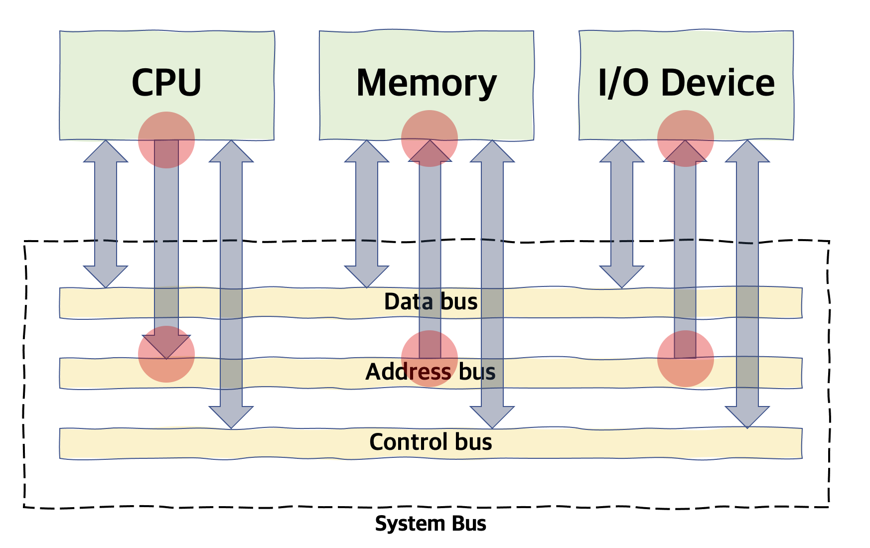 컴퓨터를 구성하는 요소(CPU, I/O장치, Memory)들을 연결해주는 통로다. 여러 하드웨어들을 물리적으로 연결해 전기적 신호로 데이터를 주고받을 수 있게 해준다. 종류는 크게 세 가지로 데이터 버스, 주소 버스, 제어 버스가 있다.