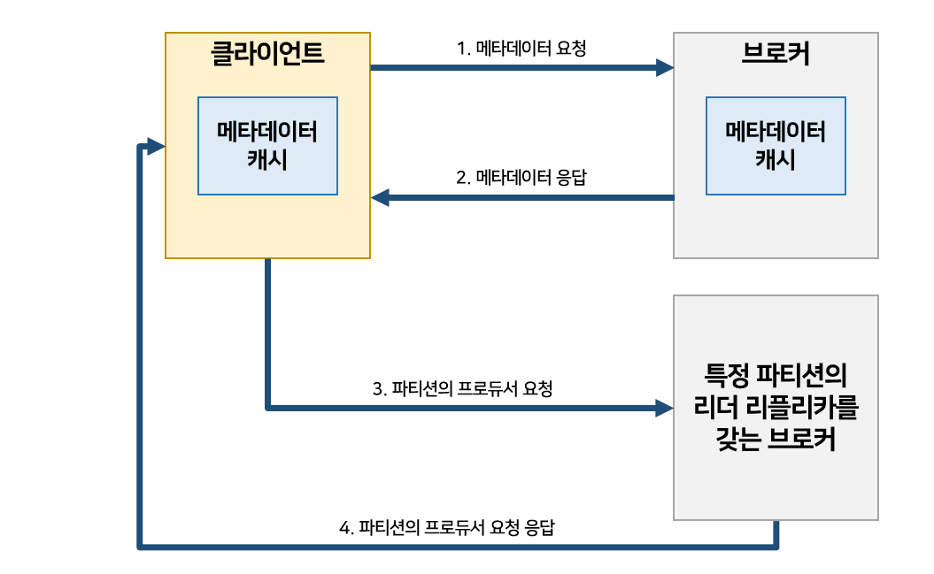 요청 타입 중에 메타데이터 요청(metadata request)라는 요청 타입이 있다. 이 요청을 하면 브로커는 토픽에 존재하는 파티션들, 각 파티션의 리플리카, 어떤 리플리카가 리더인지 등의 정보를 응답한다. 모든 브로커가 이런 정보를 담고있는 메타데이터 캐시를 갖고 있기 때문에 이 요청은 아무 브로커에게나 할 수 있다.