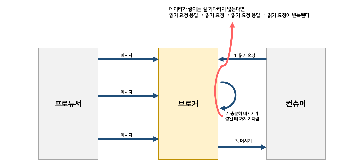 클라이언트는 반환 데이터의 max 크기도 지정할 수 있지만 min 크기도 지정할 수 있다. 반환되는 데이터가 거의 없는데도 아주 짧은 시간동안 계속 요청, 응답을 주고받으면 네트워크 트래픽만 늘어난다. “최소한 100KB가 되면 메시지를 전송해” 라는 설정을 해 빈번한 네트워크 통신을 줄일 수 있다. 모아서 보내기 때문에 네트워크 통신 횟수는 줄어들고 결국 읽는 메시지의 양은 같다.