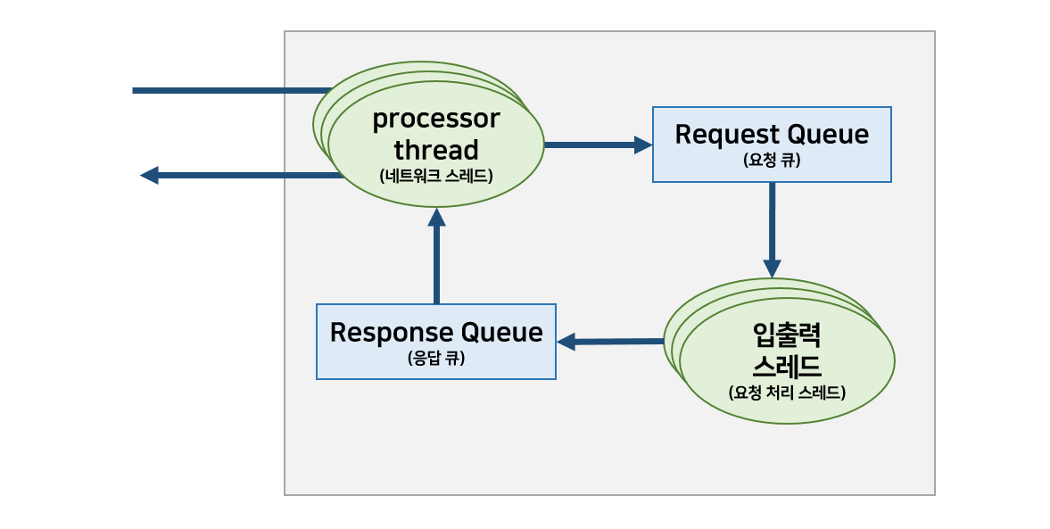 브로커는 자신이 리스닝하는 포트에서 acceptor 스레드를 실행하며 이 스레드는 연결을 생성한다. processor 스레드 (혹은 네트워크 스레드)가 그 다음 단계를 처리한다. processor 스레드는 클라이언트 연결에서 요청을 받고 요청 큐에 넣는 일, 응답 큐에서 응답을 가져와 클라이언트 측으로 전송하는 일을 수행한다. 요청 큐에 요청이 위치하면 입출력 스레드(혹은 요청 처리 스레드)가 요청을 가져와 처리한다.