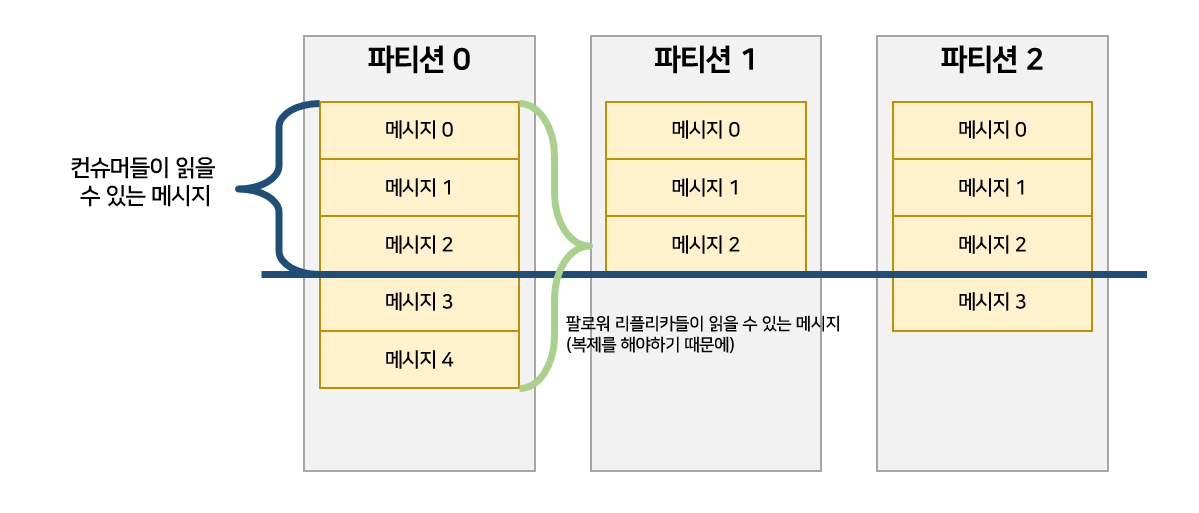 대부분의 클라이언트는 모든 ISR에 쓴 메시지들만 읽을 수 있다. 리더 리플리카에만 존재하는 메시지를 읽을 수 있게 허용한다면 일관성을 잃을 수 있기 때문이다. 팔로워 리플리카에게 복제되지 않은 메세지를 어떤 컨슈머가 읽은 후 리더가 중단되면 해당 메시지를 가지고 있는 다른 파티션이 없기 때문에 그 메시지가 사라지게 되고 다른 컨슈머들은 유실된 메시지를 읽을 수 없다. config replica.lag.time.max.ms로 복제를 기대라는 최대 시간을 지정할 수 있다.