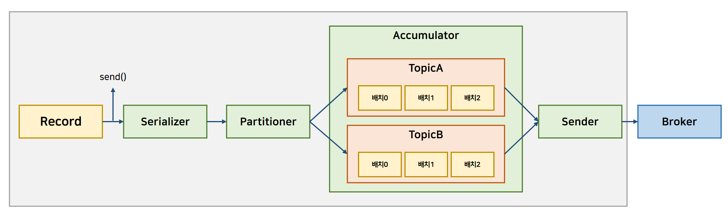 파티셔너로 어떤 파티션으로 전송될 지 정해진 메세지들은 Accumulator에 버퍼로 쌓인다. 센더 스레드는 accumulator에 쌓인 메세지를 broker에 전송한다.