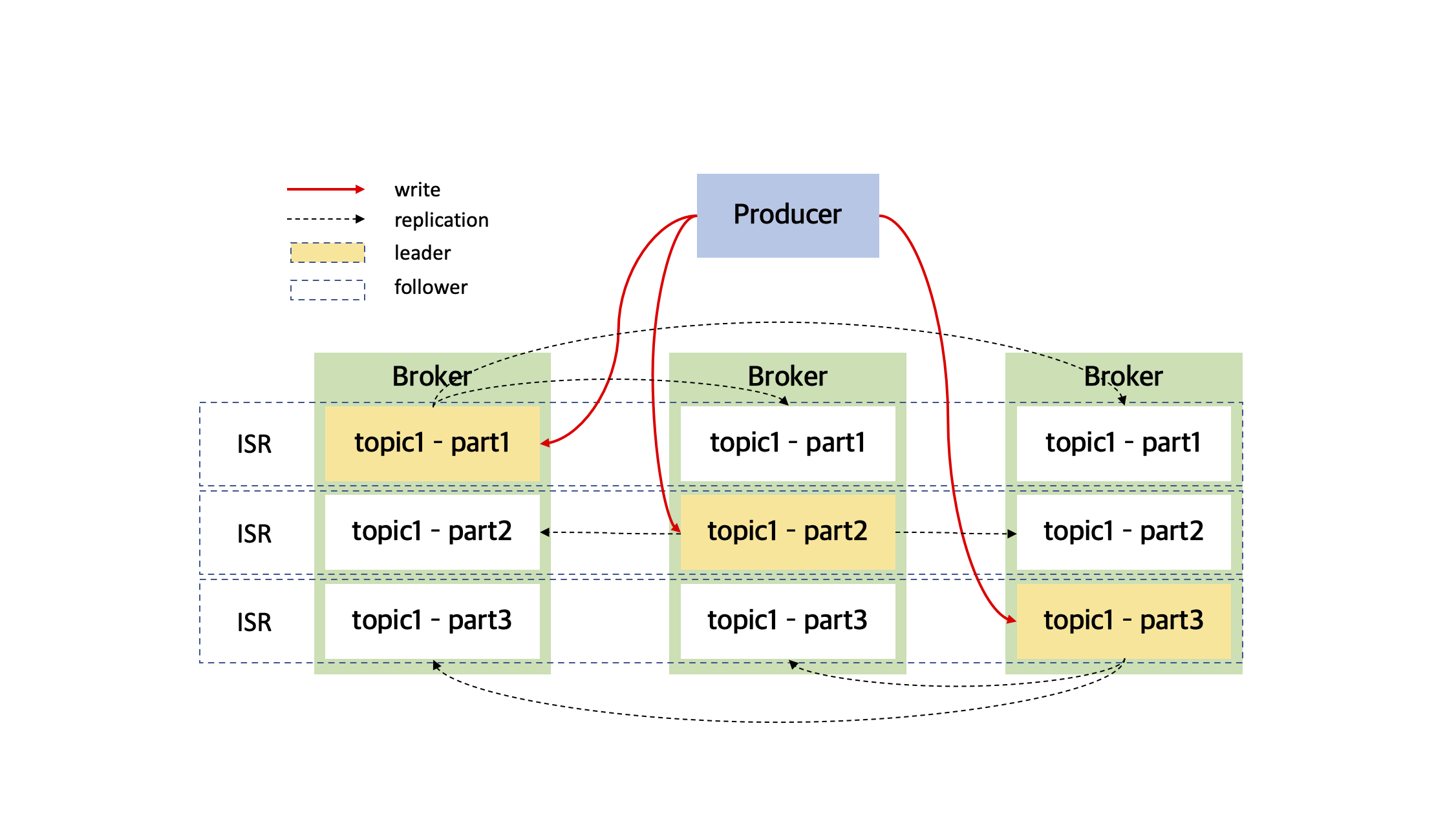 Kafka에서는 각 파티션 당 복제된 파티션 중에서 하나의 리더가 선출된다. 리더에만 메시지에 대한 읽기, 쓰기 연산이 수행되며 팔로워(리더를 제외한 파티션들)는 리더의 데이터를 복사만 하는 역할을 한다. 리더가 죽었을 경우 팔로워 중 하나가 리더가 되어야 하기 때문에 팔로워는 리더와 싱크를 맞추고 있는 것이다. (In-Sync Replica, ISR) 시스템 장애에 대한 가용성을 갖출 수 있다.